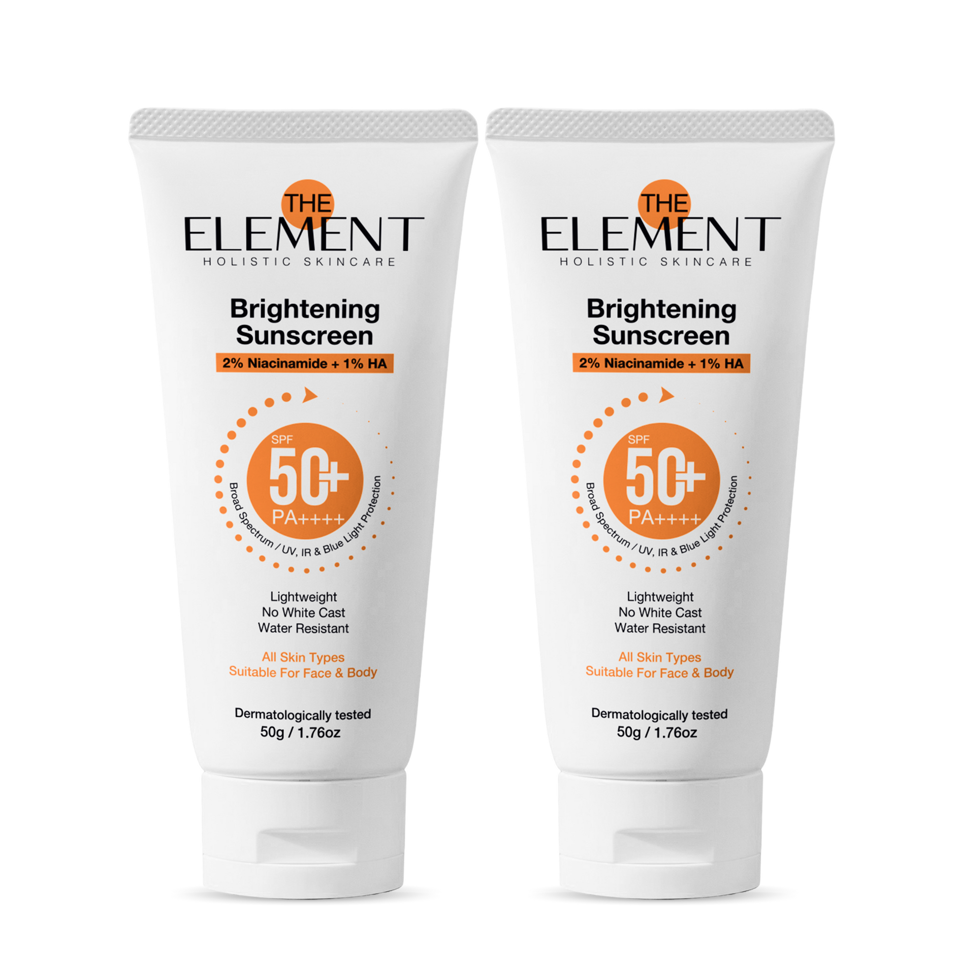 The Element Brightening Sunscreen is a lightweight, non-sticky sunscreen offering SPF 50+ PA++++ broad-spectrum protection against UV, infrared, and blue light. Enriched with2% Niacinamide and 1% Hyaluronic Acid, it brightens, hydrates, and protects your skin without leaving a white cast. Suitable for all skin types, it is water-resistant and dermatologically tested, making it perfect for daily use on both face and body.