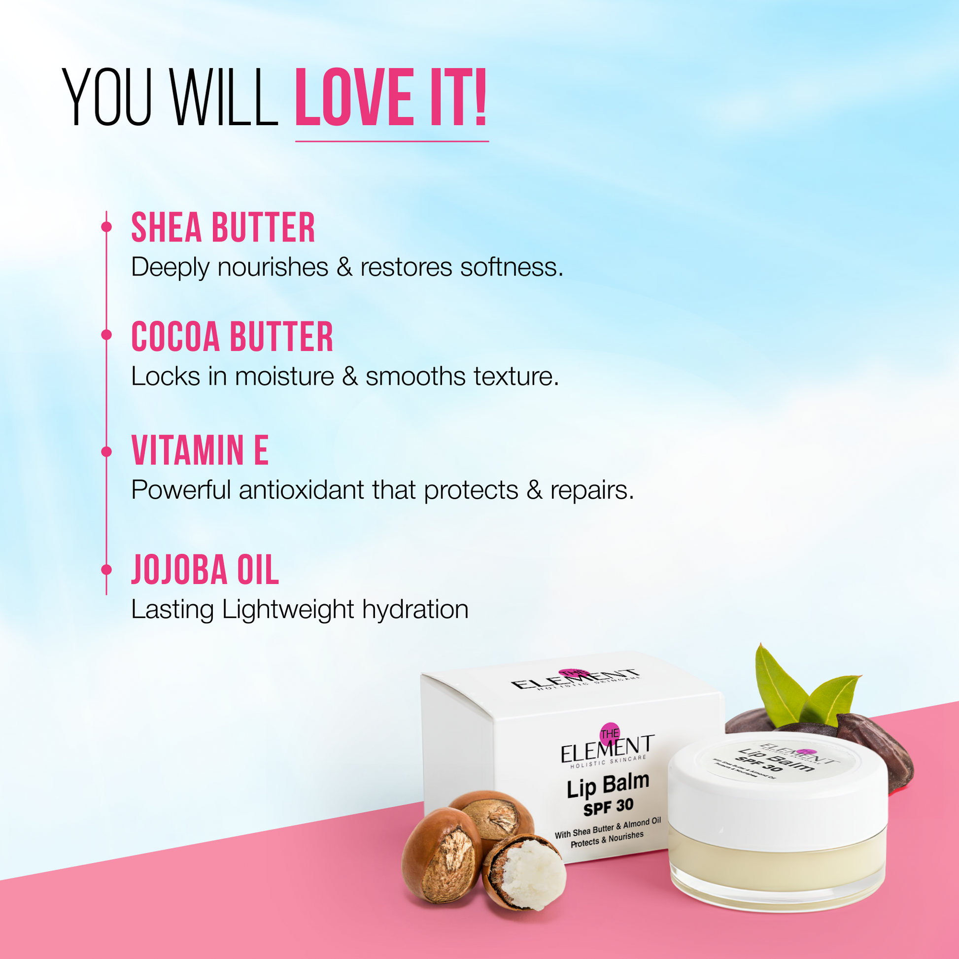 Meet your everyday lip protector and nourisher. The Element Lip Balm SPF 30 shields lips from harmful UVA and UVB rays to help prevent tanning and darkening, while its buttery texture deeply moisturizes and repairs dry, chapped lips. Made with skin-loving natural butters and oils, it glides on smoothly, leaves no heavy or sticky feel, and keeps lips soft, supple, and comfortable all day.